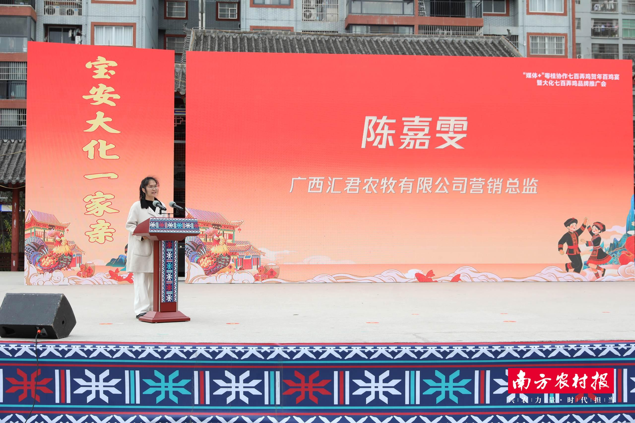 品牌发布环节上,大化瑶族自治县人民政府副县长蓝艳宇全方位讲解了七百弄鸡“雪花芦花羽、柚子身形、黄胫黄肤”的独特标识,以及从喀斯特秘境原生态放养,到富含高蛋白、低脂肪、肌苷酸等营养元素的“味养兼优”特质。