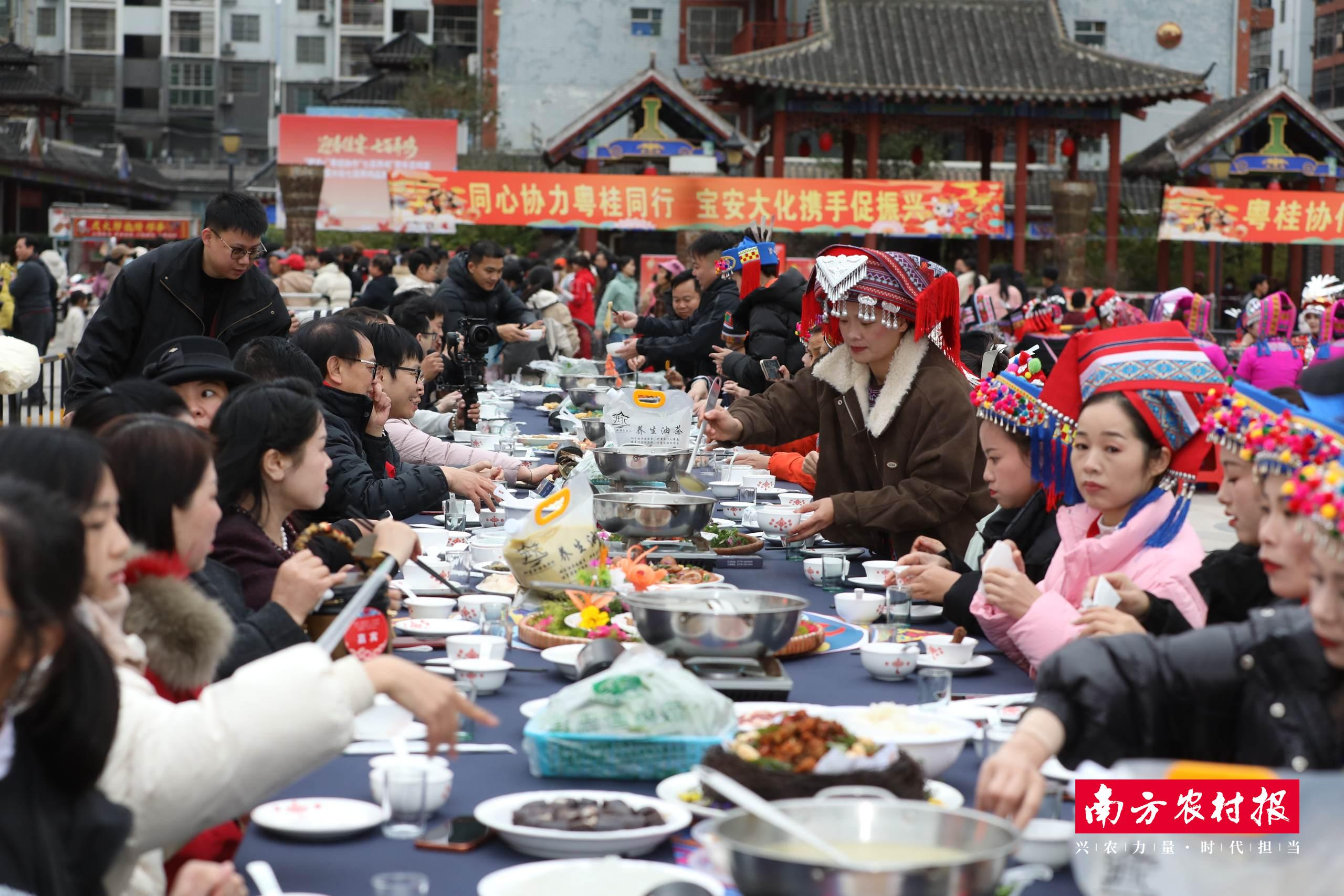 白切鸡皮爽肉嫩、七百弄鸡汤温润醇厚、涮鸡肉片鲜滑弹牙……近40道以七百弄鸡为核心、搭配大化生态食材的佳肴相继呈上,香气弥漫,引人食指大动。宴席方酣,篝火燃起。熊熊火光映照着一张张笑脸,瑶族同胞与粤桂来宾手拉手,围着篝火踏歌起舞,悠扬的山歌与欢快的笑声汇成一片。